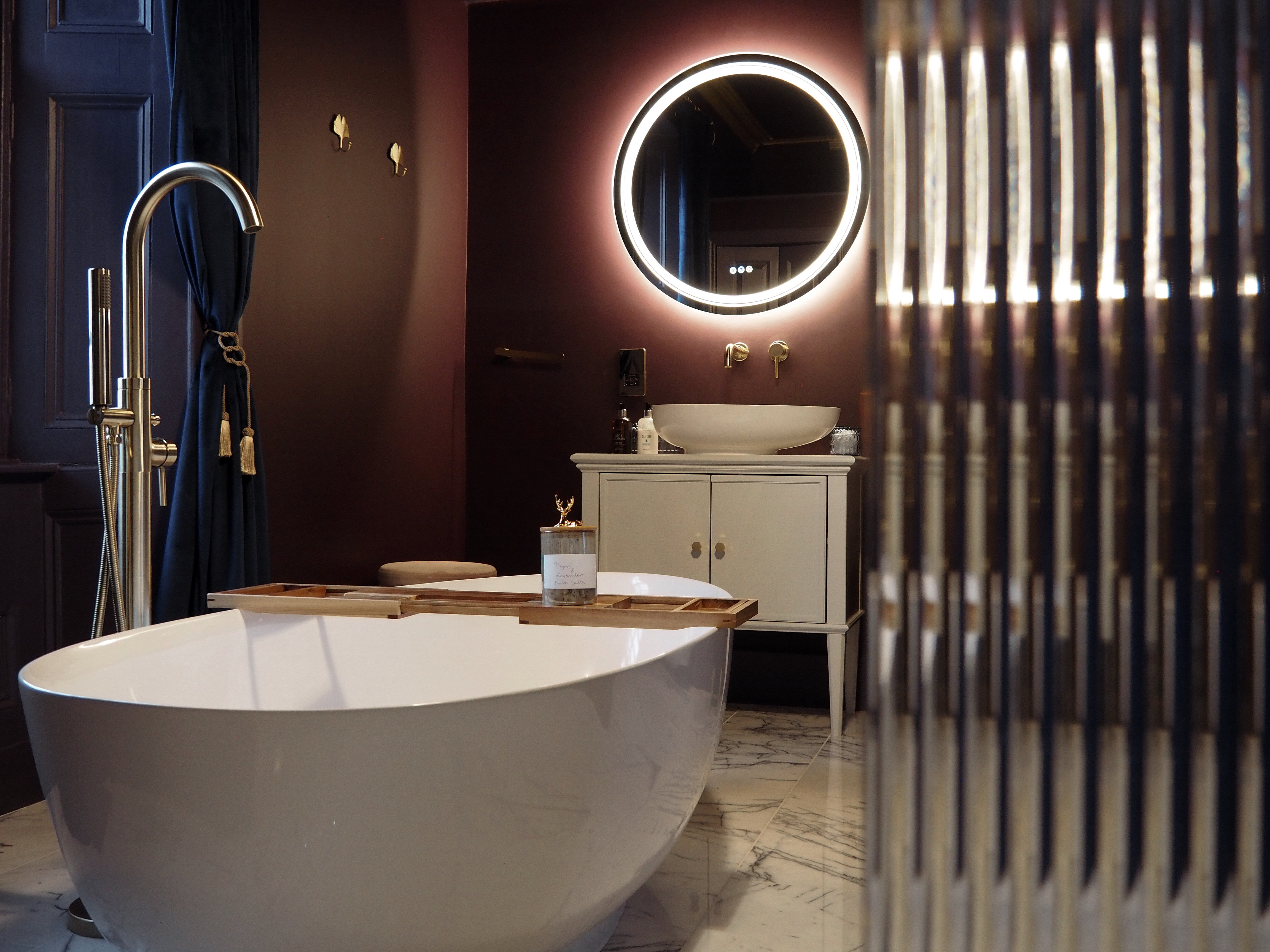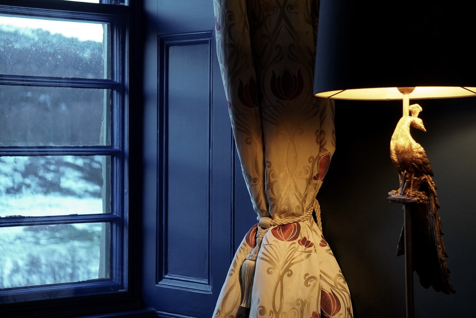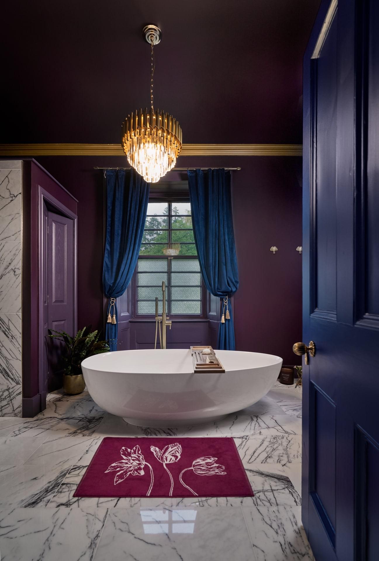 Evoking the deep blues of the Scottish lochs, our Sapphire Bedroom offers commanding views to the south and west, taking in both of our gardens, the River Avon flowing in the strath below, and the Cromdale Hills beyond, allowing you to enjoy the mountain sunsets by the roaring fire of a Jøtul stove. The en-suite bathroom is tiled in marble and features a centrepiece bath, and a wet room area with a rainfall shower and body jets. Underfloor heating adds the extra touch of comfort even on the chilliest of morning.