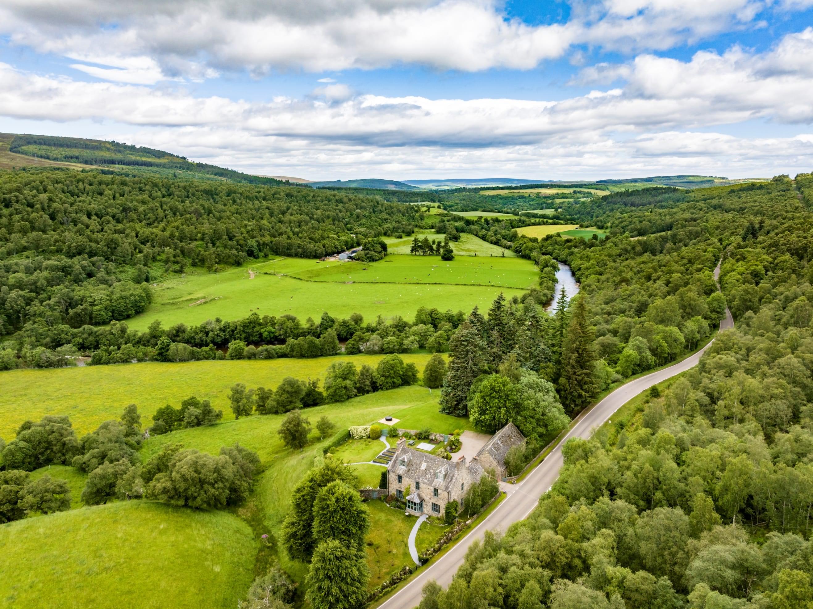 The River Avon gracefully flows through the heart of the valley below the Old Manse, a scenic waterway that originates from Loch A'an within the Cairngorms National Park, enhancing the natural beauty of the area and providing opportunities for peaceful walks and salmon fishing along its banks. Meanwhile, just above the property, a short hill walk up, the Cairnacay offers a breathtaking panorama of Glenlivet Estate and the expansive countryside beyond.